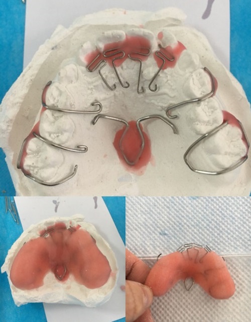 肖遥副教授果断决定,利用现有材料和器械,立即加班为患儿赶制矫治器。说到就做到,肖遥和范丽苑找来牙用钢丝,平钳,蜡,基托树脂等材料,通过午休两个多小时的工作,从制取模型,弯制卡环,蜡固定,充胶,打磨,顺利完成替牙期全牙弓反合合垫式扩弓矫治器的制作。当矫治器调试完成戴入患儿口中时,患儿家长投来感激的目光,这让医生感到无比欣慰。