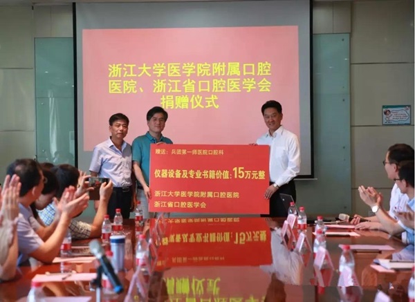 最后,浙江省援疆指挥部、第一师阿拉尔市、浙大医学院附属口腔医院、第一师医院领导在与会者们的见证下,共同为“浙江大学口腔颌面疾病诊治中心南疆分中心”揭牌。口腔医院傅柏平副院长、浙江省口腔医学会陈民栋秘书长作为代表向第一师医院捐赠了价值15万元的口腔仪器设备(机扩马达仪、热牙胶充填仪各两套)及专业书籍。