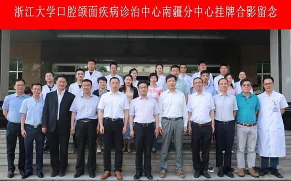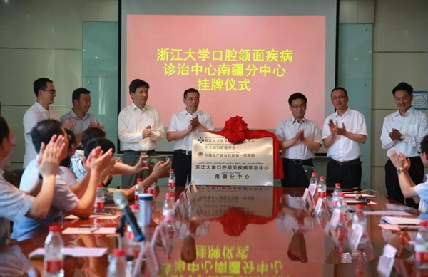揭牌仪式上,师市党委副秘书长陈伍国、师市卫生局局长霍志强、浙江省援疆指挥部人才与管理组副组长陈兵、浙大医学院附属口腔医院院长王慧明、温州医科大学口腔医学院附属口腔医院院长麻健丰、浙江大学医学院附属口腔医院副院长傅柏平,浙江大学医学院附属第一医院口腔医学中心副主任顾新华,浙江省口腔医学会秘书长陈民栋,以及浙大附属口腔医院专家、第一师医院领导、援疆专家、援建科室负责人等共同见证了“浙江大学口腔颌面疾病诊治中心南疆分中心”的成立。