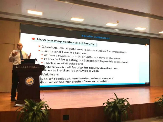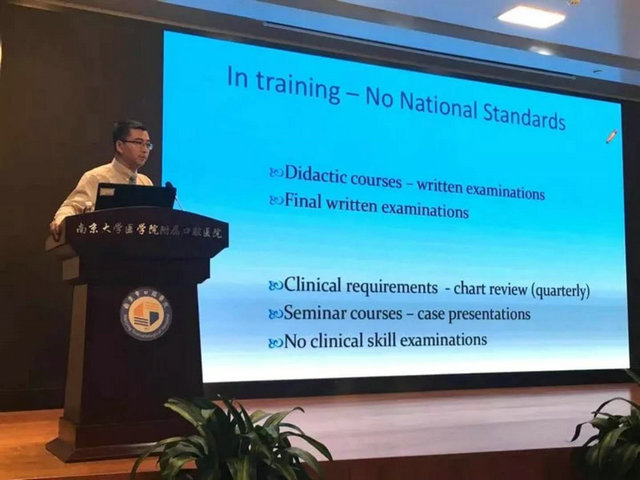 15日的大会上,Schwedhelm教授向大家介绍了美国如何在临床能力考核中考官测评力的标准化训练。香港大学牙医学院梁惠强教授以“苏格兰爱丁堡皇家外科医学院/香港牙科医学院中修复齿科联合中期考试的合作与经验”为题,向大家展示了联合评估的目标及其在香港牙科治疗培训中的作用。张海教授介绍了以胜任力为中心的美国牙科临床研究生培养,分析了全美统一的培训和考核标准。最后,南京大学医学院附属口腔医院孙卫斌教授介绍了南京大学口腔医学专业学位为核心的5+3培养体系,以及模拟训练课程的建立与实施。
