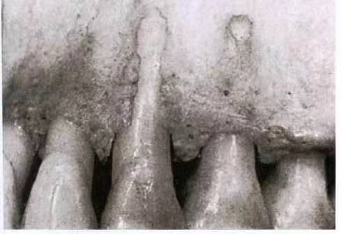骨开窗可形成粘膜开窗甚至牙髓坏死,骨开裂则可能造成牙龈退缩甚至牙周组织的严重破坏。2010年,一项通过CBCT对大量临床标本的测量,将骨缺损定义为釉牙骨质界边缘距边缘牙槽峭距离小于2mm,结果显示样本中约51.09%有骨开裂,上颌尖牙与下颌中切牙发生率最高;约36.51%发生骨开窗,上下颌侧切牙发生率最高。