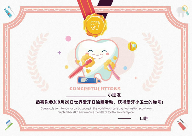 1、为50位儿童免费涂氟,涂氟前需让家长协助填写一份相应的问卷,待涂氟结束后为小朋友颁发涂氟证书就可以啦~