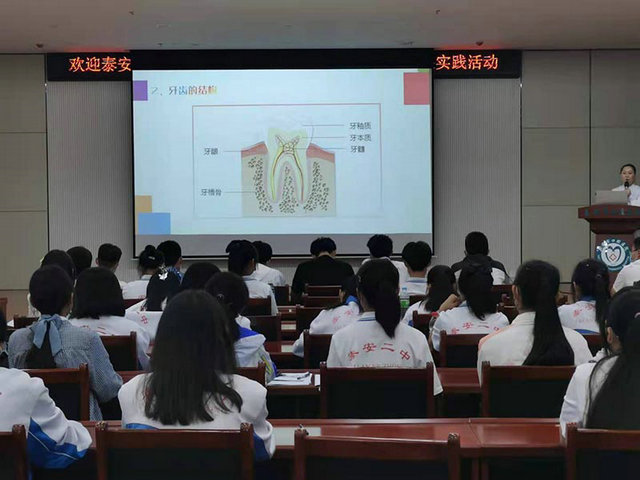 泰安市口腔医院陈伟医生针对青少年常见的口腔问题进行了“绽放青春 请从微笑开始”的口腔健康讲堂。讲堂中,陈伟医生通过多媒体就牙齿的结构、口腔常见疾病的发生及预防、牙齿正畸、阻生齿的拔除、洗牙的益处、合理饮食等多方面的内容,用图片、实例展示相结合的方式讲授了正确的刷牙方法等口腔保健措施,以及高考方面的建议。二中学生积极好学,对不明白的口腔问题积极提问,医生们一一作了详细回答。