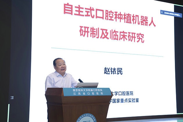 随后,“现代科技与口腔医学”学术论坛在口腔医院门诊综合楼15楼报告厅举办。本次论坛由南京医科大学附属口腔医院、江苏省口腔转化医学工程研究中心、江苏省口腔医学会联合举办,线上线下同步进行。王林会长、徐艳院长先后致辞。赵铱民院士、廖文和教授分别以“自主式种植牙机器人的研究进展”“口腔数字化建模技术与应用”为题,作了精彩的学术报告,分享了他们在种植牙机器人、口腔数字化建模领域的自主研发和临床应用进展。论坛由严斌副院长、江苏省口腔转化医学工程研究中心郑凯副主任共同主持。
