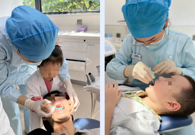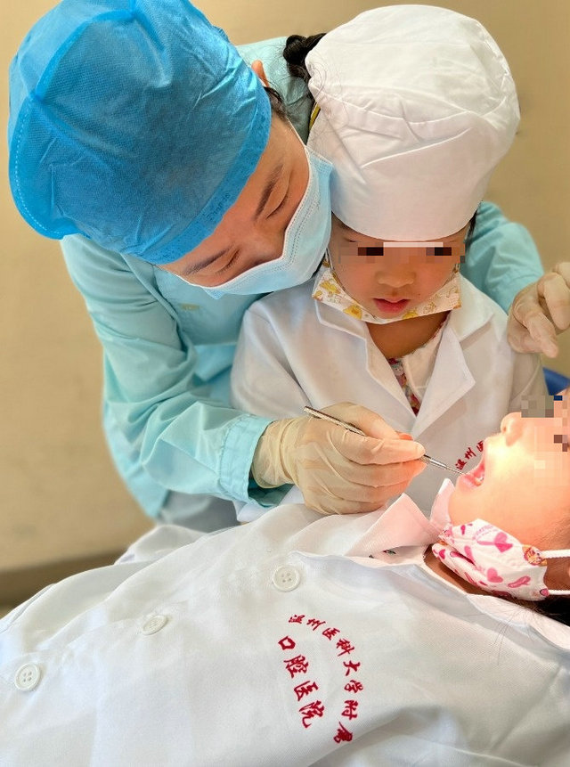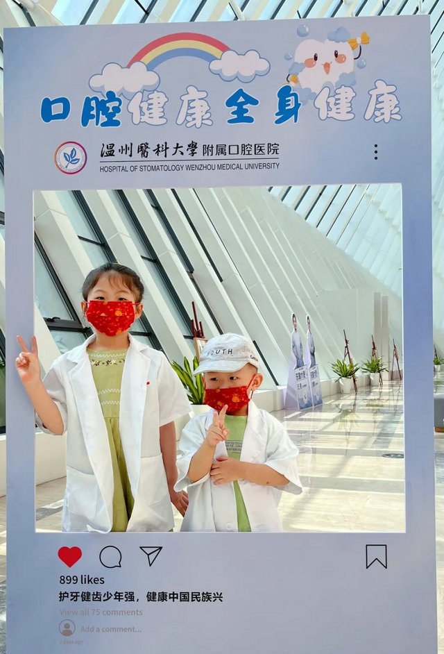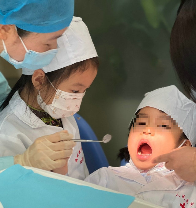 当天上午9:00和下午14:00,小朋友在父母陪同下一起,走进了温州医科大学附属口腔医院龙湾总院和广场路院区,一起体验做一名“小牙医”。