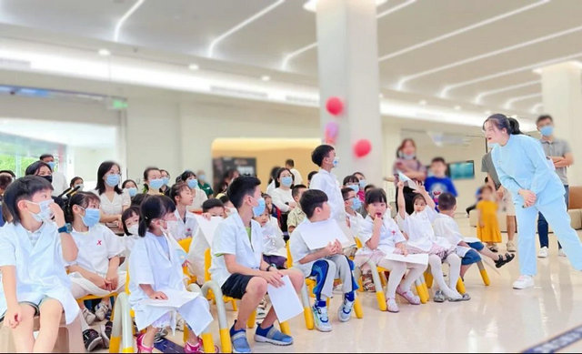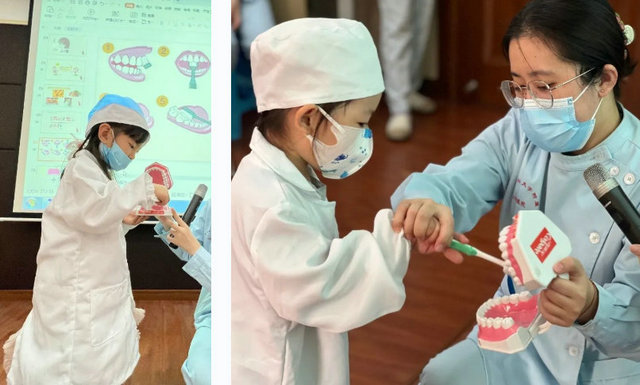 医护人员为小朋友分发牙刷套装,换上“小牙医”工作服。牙医课堂上,儿童口腔科陈欢欢医生为“小牙医”们讲解牙齿的结构、龋齿的发展过程、怎样刷牙、如何保护牙齿等系列口腔保健知识,循序渐进的引导大家保护好自己的牙齿。孩子们还通过参与趣味口腔知识竞答了解了更多关于口腔的常识。