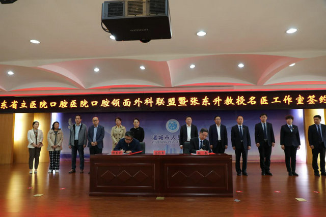 山东第一医科大学口腔医学院院长、山东省立医院口腔医院执行院长张东升教授带领专家团队成员,与中共诸城市委常委、统战部部长,诸城市人民政府副市长、党组成员,市政协党组副书记姜俊刚,诸城市卫健局党组书记、局长王洪阳,诸城市人民政府办公室三级调研员、市人民医院党委书记孙鲁安,诸城市人民医院党委副书记、院长张毅出席签约揭牌仪式。