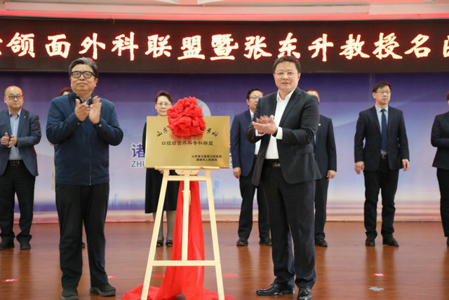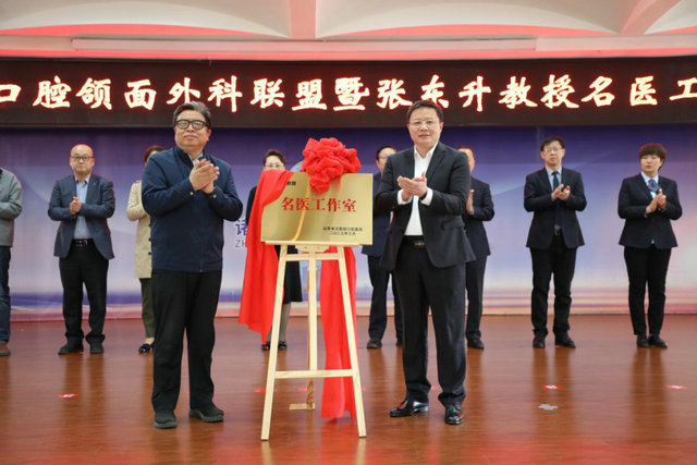 张东升院长与姜俊刚副市长为“山东省立医院口腔医院口腔颌面外科专科联盟”、“张东升教授名医工作室”揭牌。