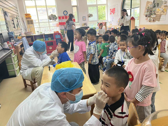 接下来的口腔检查也在校方的积极配合下井然有序地顺利完成,检查的医生一丝不苟、态度和蔼,并为孩子们进行口腔局部用氟治疗,防止龋齿发生。