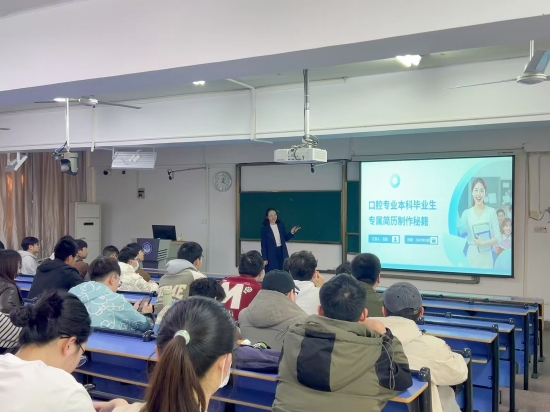 班级导师石慧为毕业生带来《口腔专业本科毕业生专属简历制作秘籍》专题讲座。石慧从用人单位视角出发,深度解析简历作为求职“敲门砖”的核心价值,通过案例教学详细讲解简历结构布局、内容撰写规范及排版设计技巧。她建议毕业生结合口腔专业特色和自身优势制定差异化求职策略,强化职业画像与岗位的契合度。