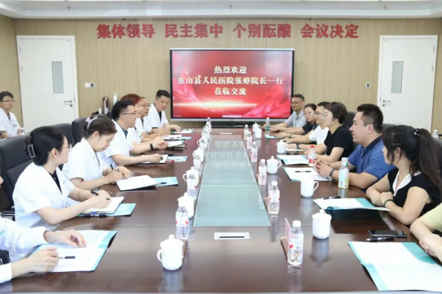 8月21日,新疆和田地区皮山县人民医院党委委员、副院长张婷带队,携相关科室负责人及业务骨干共9人专程来医院交流学习。院党委书记陈明,党委委员、纪委书记李纳新,总会计师牛瑛茹,工会主席张新松及相关科室负责人参加会议。